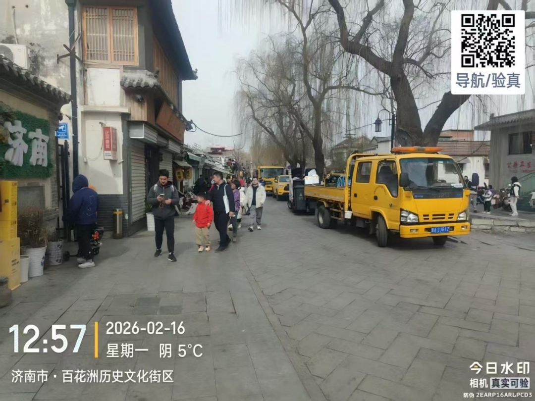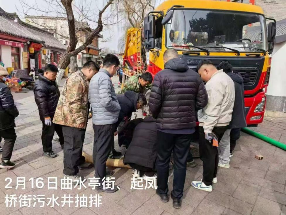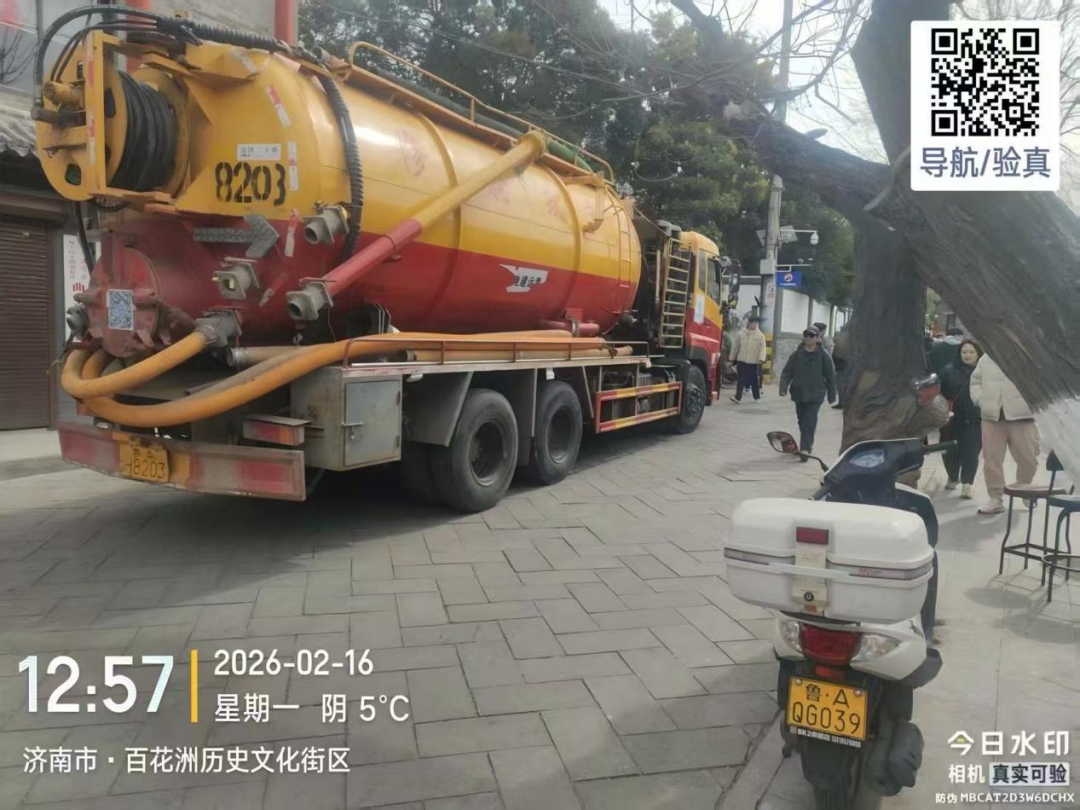 从细微处的暖心相助,到突发状况的雷霆出击,排水人的守护从未缺席。历下区曲水亭街起凤桥街突发污水冒溢情况,直接影响市民节日出行与街区环境。中片区运维中心接到指令后,迅速启动应急处置预案,第一时间调配专业疏通吸污车辆及骨干作业人员赶赴现场。工作人员各司其职、高效协作,通过精准探查、强力吸污、科学疏通等规范流程,快速处置污水冒溢问题,及时恢复了区域排水秩序,以“闻险即动、处置有力”的实战能力,守护了老城区新春佳节的整洁与安宁。